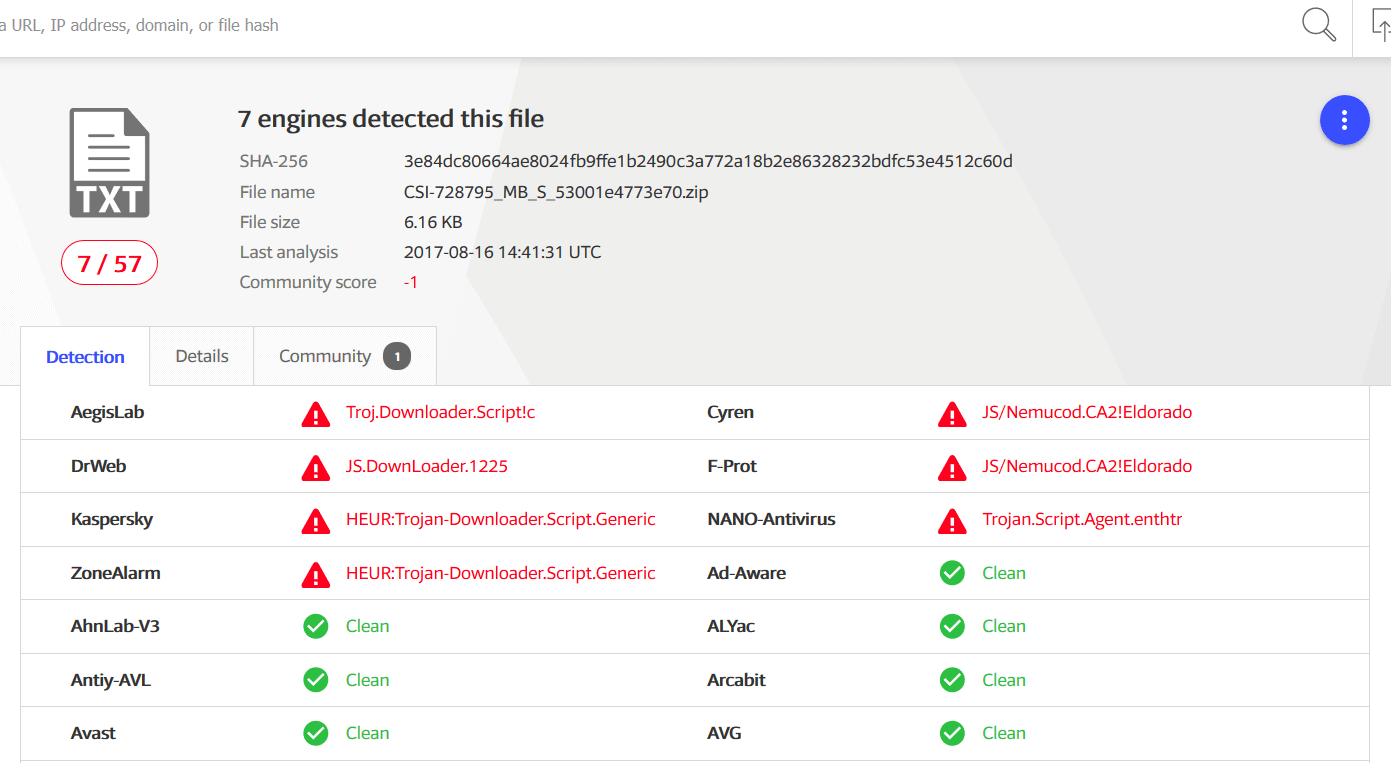 You can see below data from Virus Total and the number of AV engines detecting the spam campaign.
