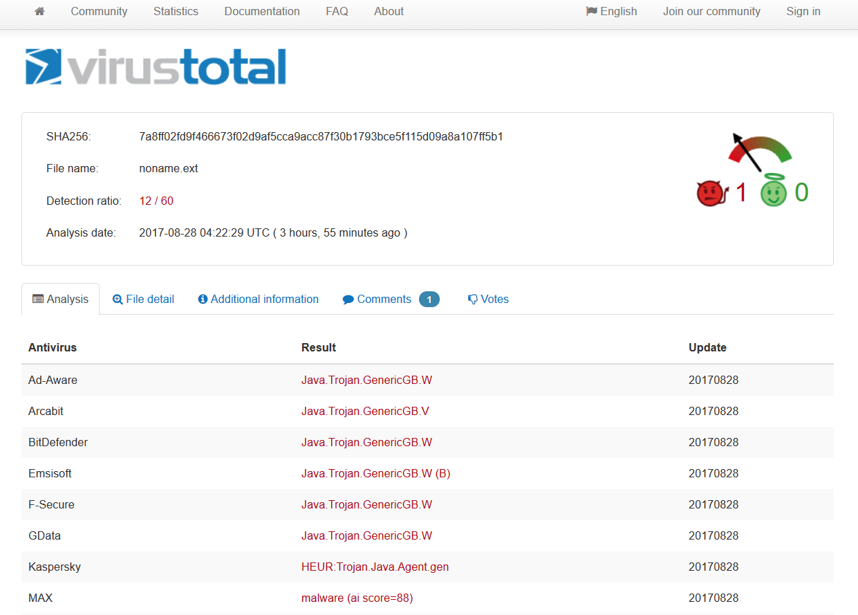 Here’s the AV detection rate by Virus Total.