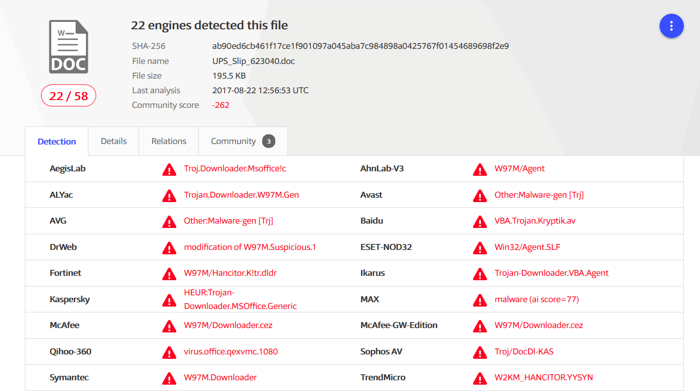 See here the data shown by VirusTotal and how many antivirus engines initially detected the spam campaign.