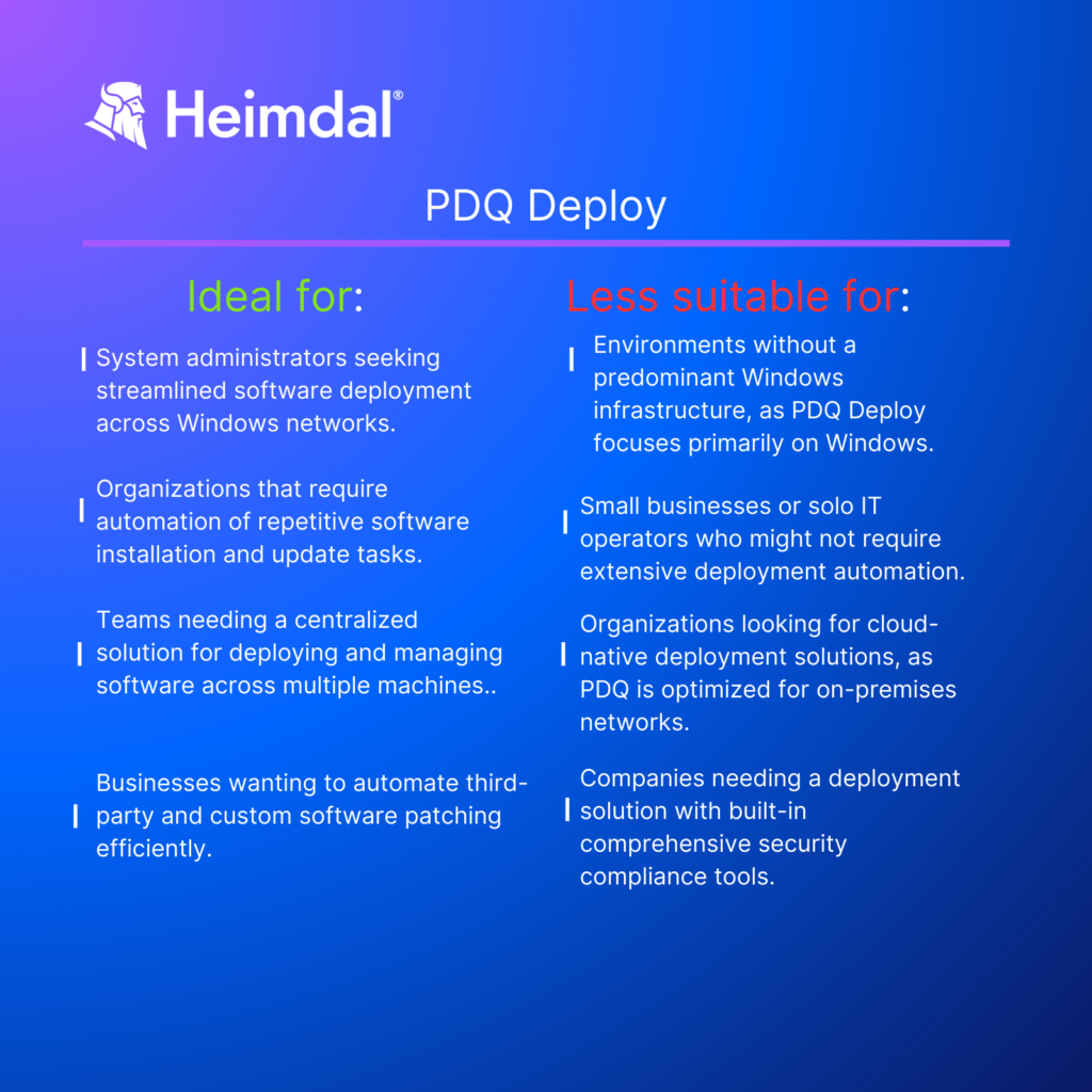 Infographic describing what PDQ Deploy is ideal for versus less suitable for.