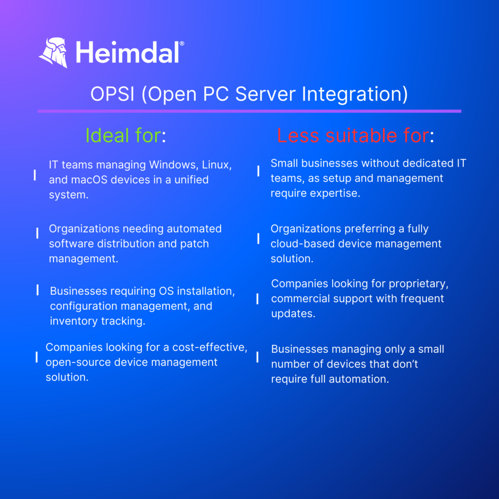 Infographic describing what Heimdal Patch & Asset Management is ideal for versus less suitable for.